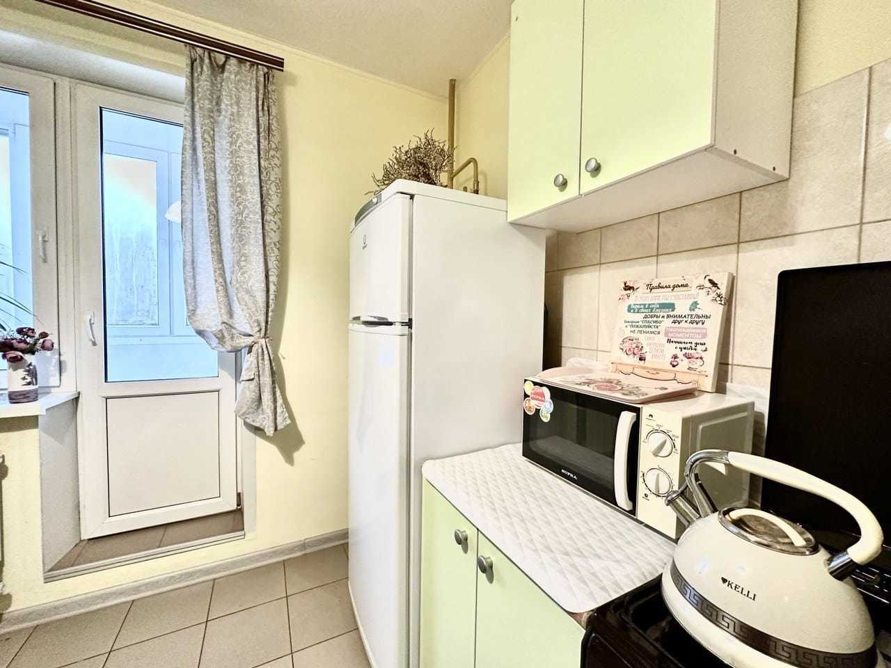 Плита, посуда, столешницы и холодильник — всё моется до блеска, без следов предыдущего заезда.
