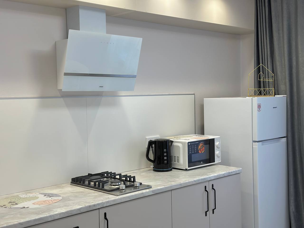 - Кухня с плитой, холодильником, микроволновкой, посудой и утварью