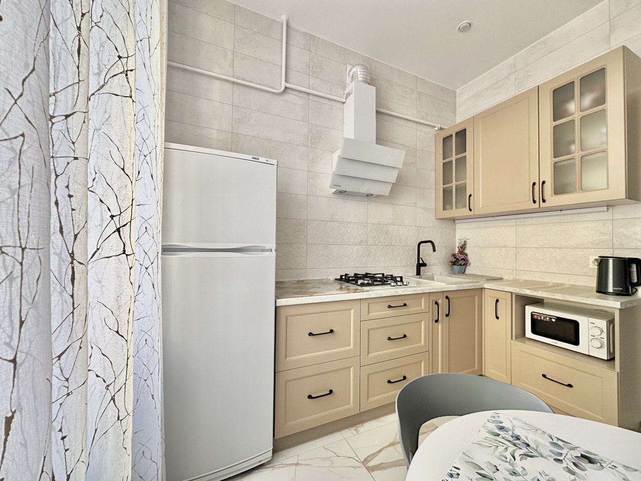 - Кухня с плитой, холодильником, микроволновкой, чайником и посудой